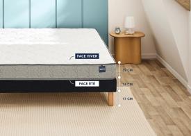 Bultex L'ensemble matelas + sommier Efficient, conçu pour les amateurs de fermeté, est idéal pour un couchage quotidien. Il vous assure excellent maintien et aération. Dimensions : 80/.../200 x 190/200 cm Confort Ferme = Accueil Ferme + Soutien Ferme + Sommier Ferme MATELAS RÉVERSIBLE Faces hiver et été adaptées à la saison pour dormir sereinement toute l’année. Un matelas réversible offre un meilleur confort dans le temps. ECHNOLOGIE BULTEX NANO Excellent maintien, aération et durabilité à tout petit prix. RAFFERMIT LE CONFORT DU MATELAS Idéal pour apporter un soutien ferme à votre literie. 1. Tissu Anti-acariens et antibactérien, le tissu 100% stretch apporte aussi douceur et confort. 2. Mousse de confort Apporte une touche de confort supplémentaire pour un accueil en douceur. 3. Fibre polyester Partie intégrante du matelas, elle offre gonflant et amplifie l'aération du matelas. 4. Cœur de 15 cm Bultex® nano (5% origine durable) La technologie Bultex® nano 33 kg/m3 offre la meilleure résilience, aération et durabilité. 5. Fibre polyester Partie intégrante du matelas, elle offre gonflant et amplifie l'aération du matelas. 6. Poignées verticales Facilitent la manipulation du matelas. 7. Sommier Ferme Idéal pour raffermir le confort du matelas Efficient. Disponible en 5 coloris. Pieds inclus. 2 pieds supplémentaires et un kit de liaison sont inclus avec tous les sommiers à partir de la dimension 160 x 200 cm. Caractéristiques Confort : Ferme Accueil : Ferme Soutien : Ferme Épaisseur du matelas en cm : 19 Traitement(s) : Anti-acariens et antibactérien ensemble literie